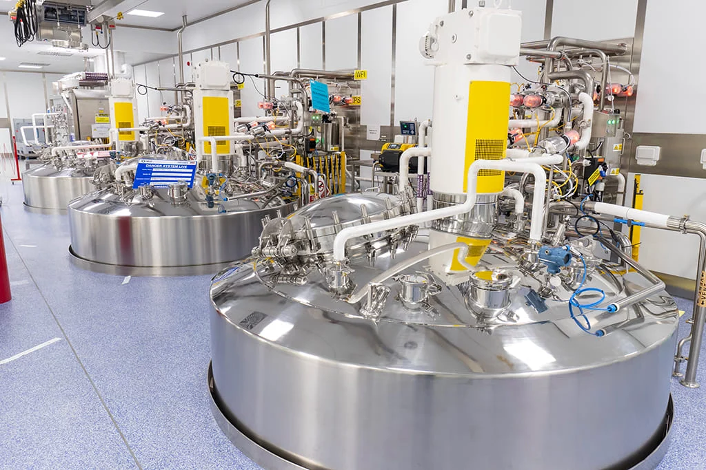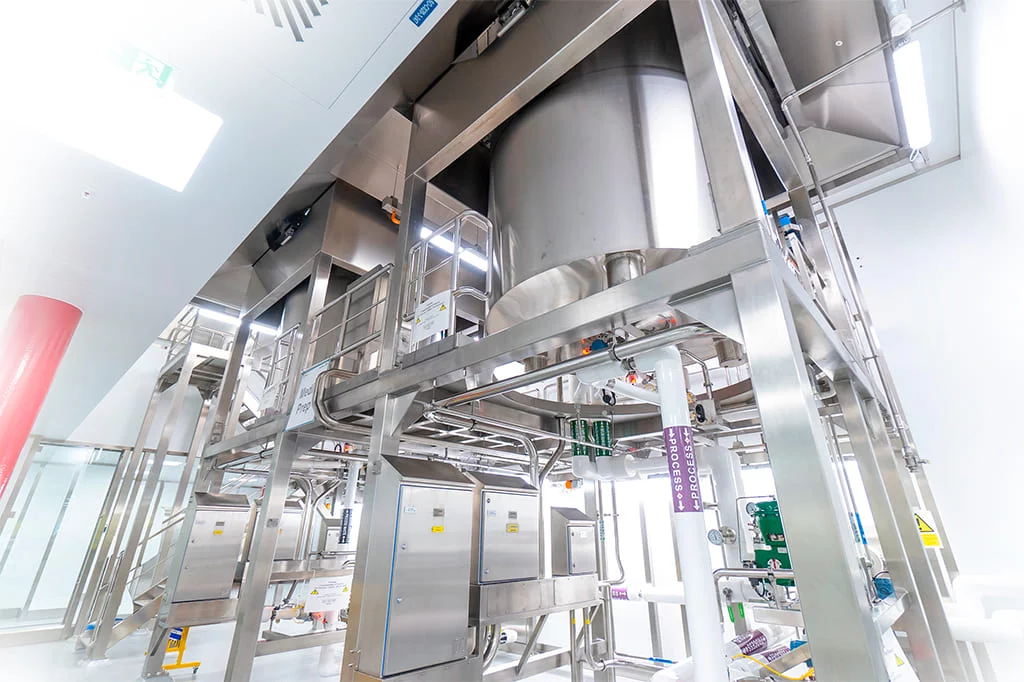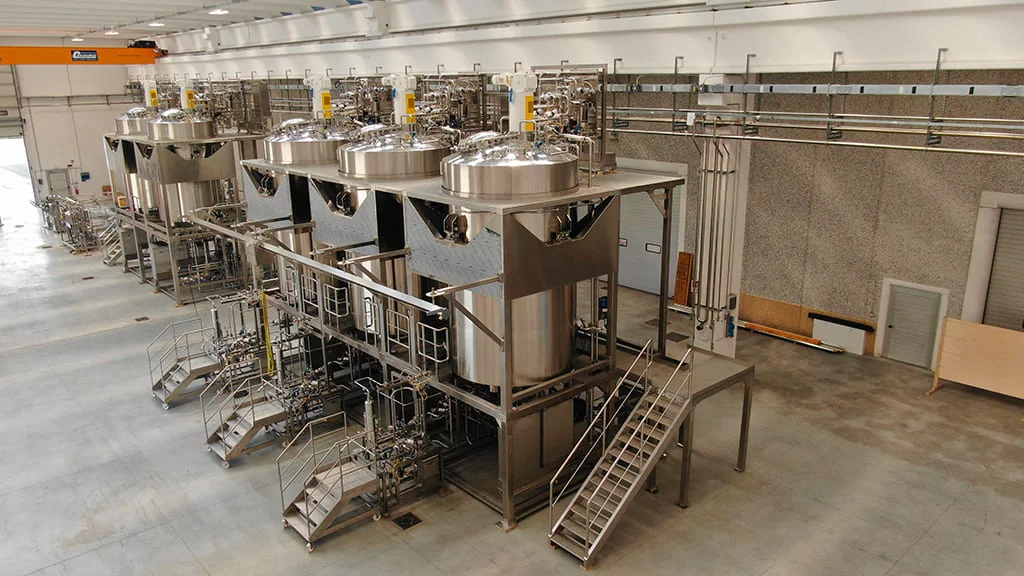 The giant plant for media and buffer is composed of two macro areas – that correspond to two different rooms at customer’s site, subdivided into 18 modules. The Buffer Room is designed to position three Buffer Hold Tanks, 15.000 L each; the Media Preparation Room two Media Prep Tank, 10.000 L each.