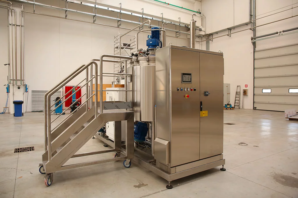 It’s composed of one 750 L homogenizer fixed tank jacketed; heated loop to filling line; stainless-steel skid; one temperature control unit; a rotor/stator homogenizer with AISI 316L impeller, max. product viscosity 100 cP, max. speed 2.800 rpm; one anchor mixer for max. product viscosity 100 cP, polish: Ra<0,5 µm; load cell weighing system; one CIP SKID (stand-alone unit).