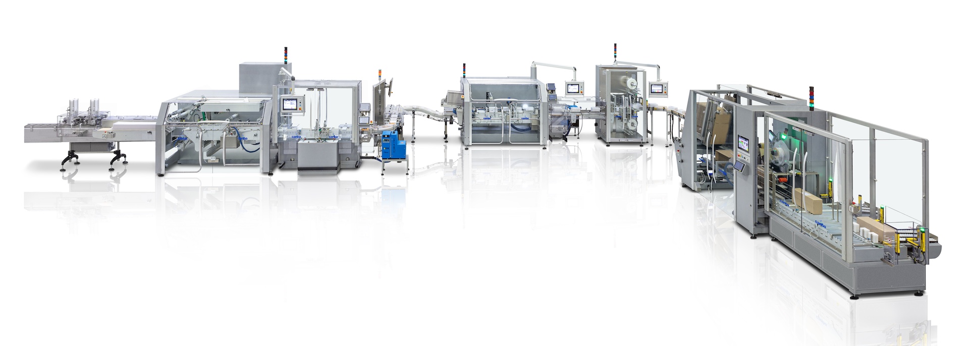 Complete secondary packaging line at 100 cartons/minute, composed by intermittent motion cartoner, print/inspect for serialization, check-weigher, tray former and loader, bundler and case-packer with aggregation and print & apply labeler.