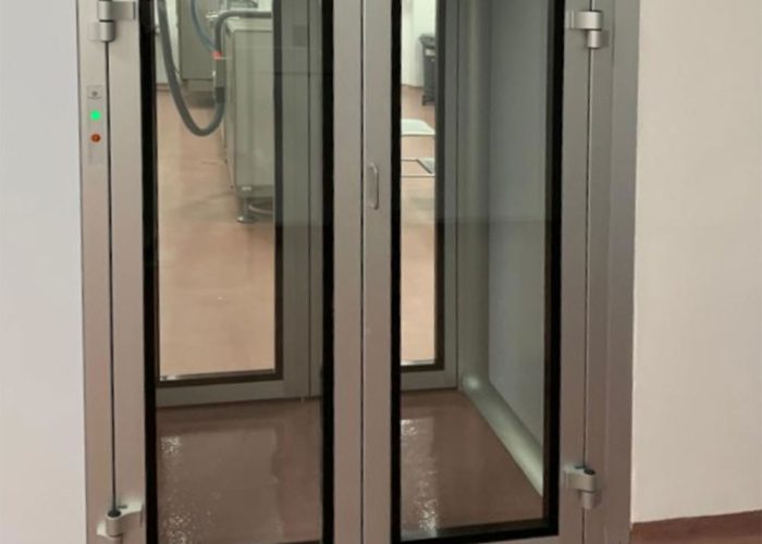 The fully glazed doors allow high visibility and are made with the same aluminum profile as the doors with perimeter seals and fixed stainless-steel handles. Internal surfaces can be coated with stainless steel AISI 304SB.